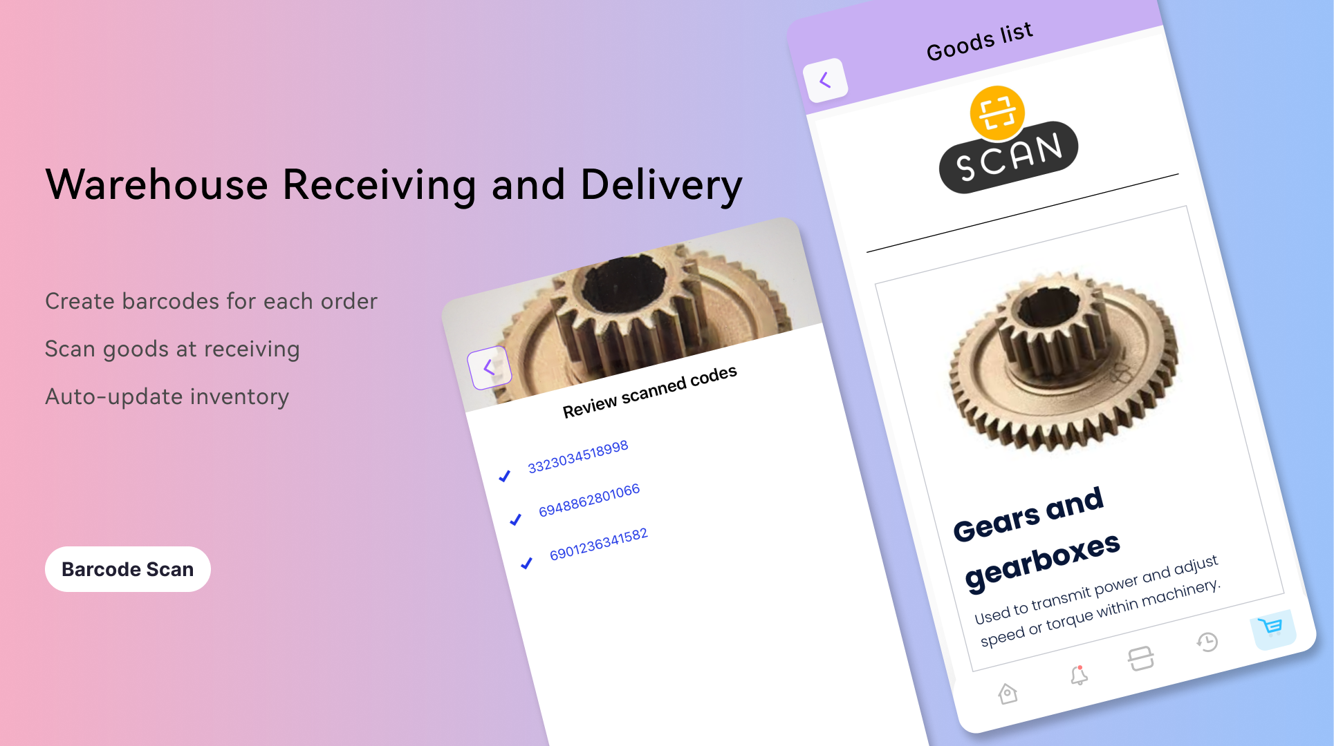 - Scanning: Warehouse staff scan the barcode at receiving or delivery using a mobile device (Barcode Scan Action).